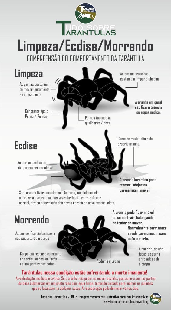 caranguejeiras, tarantulas, terrários Compreensão do comportamento da tarântula. Publicado por tocadastarantulas em 3 03America/Sao_Paulo setembro 03America/Sao_Paulo 2019 Veja na imagem abaixo as diferenças comportamentais de quando as tarântulas estão: Se limpando, Trocando de exoesqueleto e morrendo. Compartilhe isso: Compartilhar no X(abre em nova janela) 18+ Compartilhar no Facebook(abre em nova janela) Facebook Curtir Carregando... Relacionado