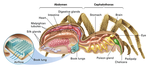 O sistema respiratório, localizado no abdome, consiste em preservar os pulmões e traqueias . Nas aranhas, os pulmões foliáceos são órgãos respiratórios pareados compostos de 10 a 80 folhas ocas que se estendem para um seio sanguíneo separado por pequenas colunas endurecidas. Os pulmões abrem-se em câmaras (átrios), que se abrem para o exterior através de uma ou várias fendas (espiráculos). As traqueias são tubos que conduzem o ar diretamente para vários tecidos. Os dois órgãos respiratórios na extremidade frontal do abdome geralmente são pulmões foliáceos, e os dois traseiros são traqueias. No entanto, em alguns grupos, ambos os pares são pulmões foliáceos (como nas tarântulas). É impossível determinar, a partir da estrutura da superfície, se uma aranha tem pulmões foliáceos , traqueia ou ambos, porque os órgãos respiratórios são cobertos no exterior por placas endurecidas.