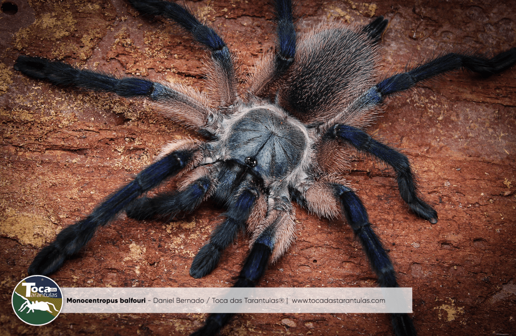 Monocentropus balfouri Pocock, 1897, também conhecida como “Babuína azul da ilha socotra”, é uma tarantula muito bonita devido à sua coloração e comportamento da ilha de Socotra, parte da República do Iêmen. No entanto, ela tem sido ligada com aranhas babuínas, ela pertence à subfamília da Eumenophorinae e não à Harpactirinae. Tarantulas africanas são comumente dadas o título de aranhas babuínas, o que explica por que ela carrega o nome. A espécie é muito popular entre os hobistas no exterior, por causa de sua aparência fofinha e capacidades de viver em comunidade, algo muito diferente das demais tarantulas. Em 2014, ela até foi eleita a tarantula mais bonita do mundo (fonte). Mais de 30 aranhas foram descritas, mas a Atrophothele socotrana e Monocentropus balfouri são as únicas espécies endêmicas de Socotra pertencentes à subordem da Migalomorphae.