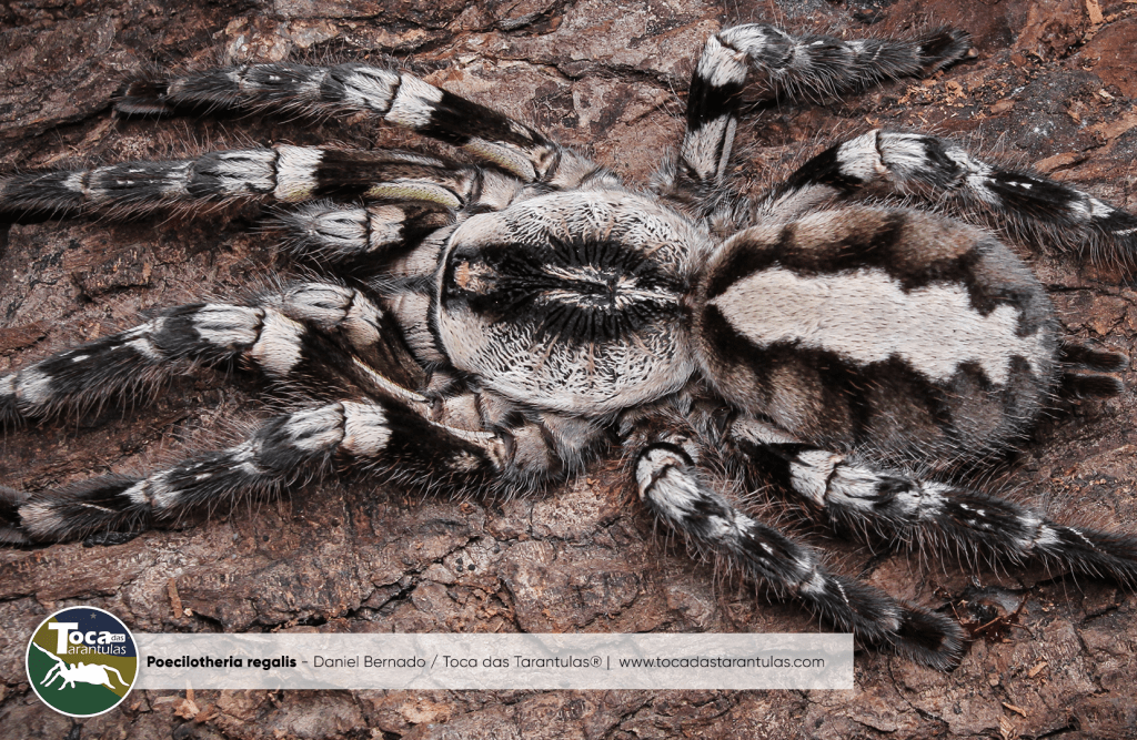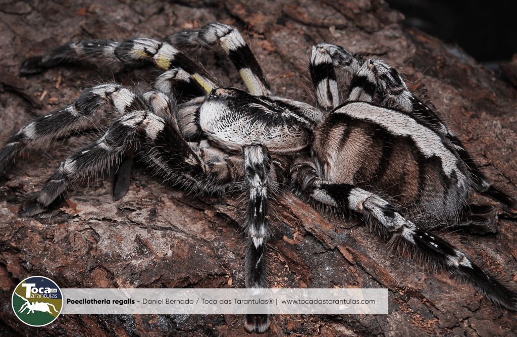 Poecilotheria regalis Pocock, 1899, também conhecida como “tarântula ornamental indiana”, é uma bela aranha devido à sua coloração, padrão e comportamento. No entanto, ela é a mais comum entre os “Pokies”, ela é uma tarântula robusta e bonita. Poecilotheria regalis é muito semelhante à Poecilotheria fasciata, na coloração do corpo e dos membros, mas pode ser imediatamente distinguida como de todas as outras espécies conhecidas do gênero pela presença da larga faixa avermelhada no lado inferior do abdômen. O gênero Poecilotheria é bem equipado com cores e padrões distintos, onde as pernas 3, 4 e os pedipalpos mostram um padrão alternado em preto e branco. Intrigante sobre o gênero é sua pose típica de descanso. Com os dois primeiros pares de pernas para a frente, os dois últimos pares de pernas para trás e um olhar intimidador.