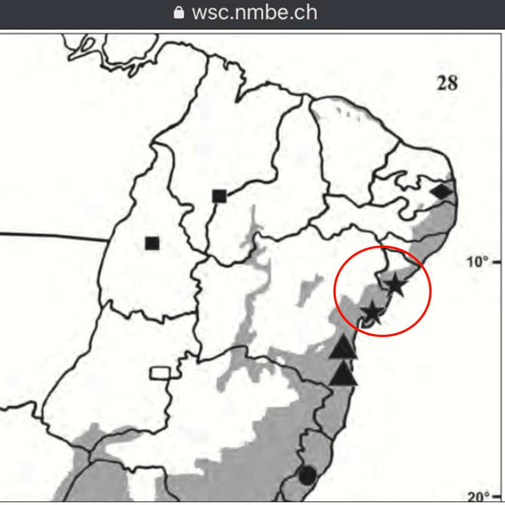 Area de ocorrência: Bahia e Sergipe – Brasil (devido ao estudo limitado e à impossibilidade de localizar, sua verdadeira extensão de distribuição ainda é desconhecida).