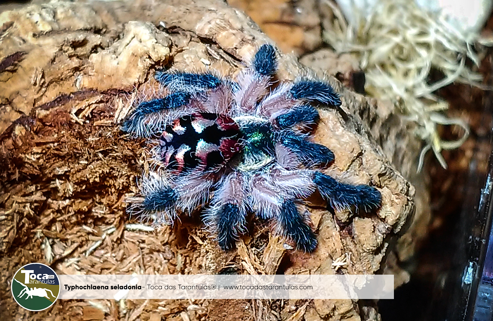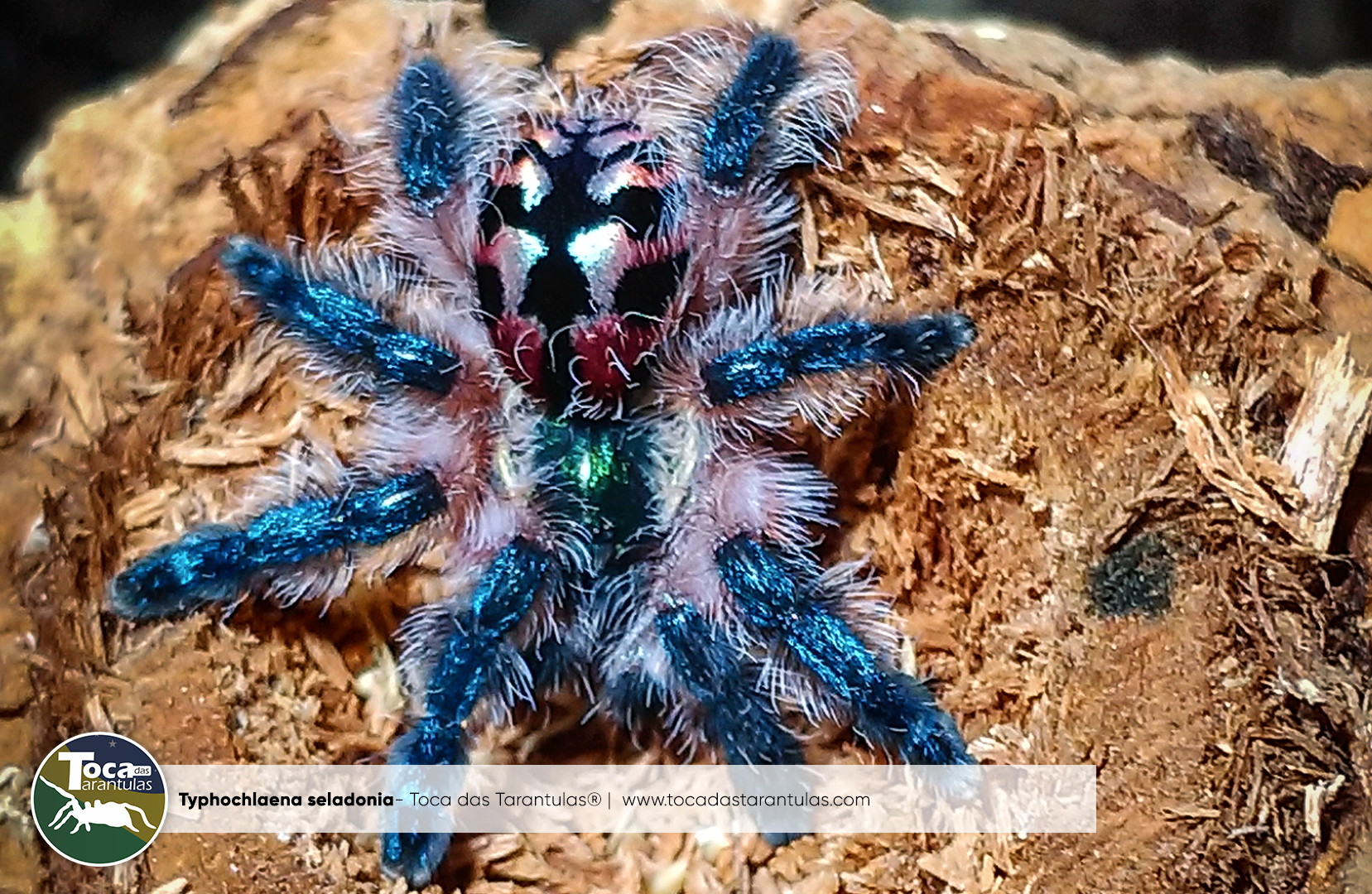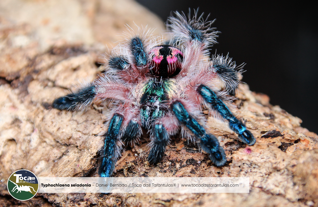Typhochlaena seladonia – (C. L. Koch, 1841), ou conhecida popularmente como Tarântula joia brasileira, é provavelmente a tarântula mais bela da Terra, embora não sejam frequentemente vistas (quando mantidas em cativeiro e também na natureza), são uma das aranhas mais lindas que se conhece até o dia de hoje. Um aranha de alçapão arborícola anã impressionante, cheia de cor e coragem. Elas compõem seus alçapões como um artista pintando sua própria casa. A T. seladonia arranca pedaços de casca e líquen da árvore na qual estão construindo o alçapão para construir uma pele (tampa) altamente camuflada. Elas são comedoras vorazes e caçam de maneira incomum para uma tarântula arbórea. Elas esperam em seu alçapão que a presa apareça e pulam do alçapão para agarrar seu alimento e rapidamente recuam para dentro da toca.