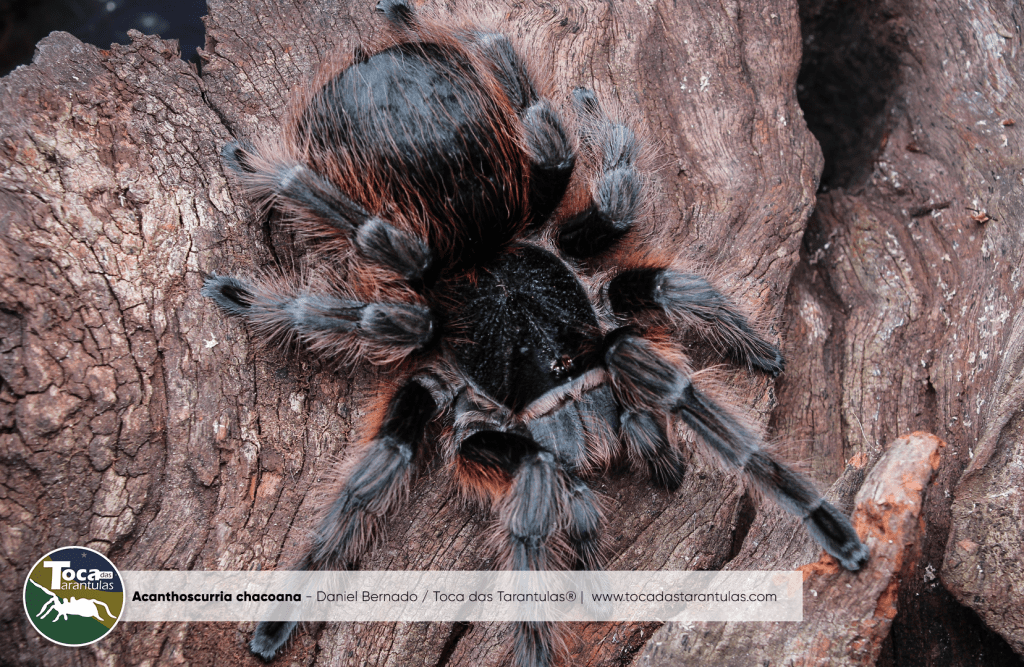 Acanthoscurria chacoana (Brèthes, 1909), fica mais fascinante à medida que fica maior, elas ficam realmente grandes em torno de 18cm. Ela é uma espécie muito bonita também com a cerdas avermelhadas por todo seu corpo, mas os padrões brancos claros nas pernas fazem grande contraste com suas pernas escuras, cefalotorax e abdômen vermelho costumam ser felpudos.